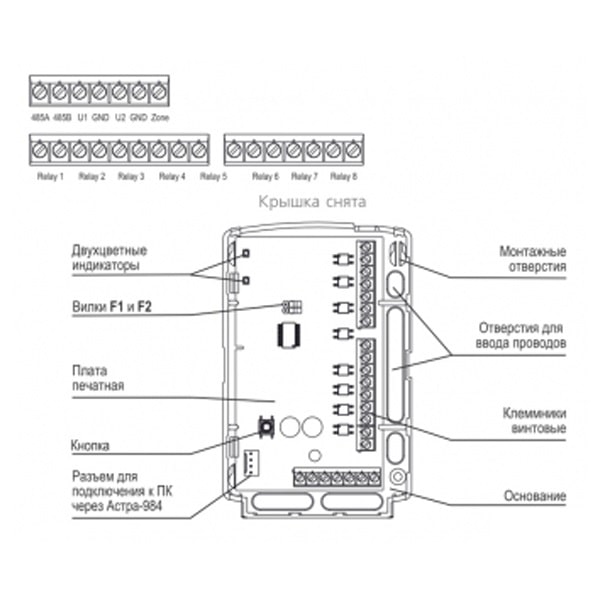 —цифровой интерфейс стандарта EIA RS-485 для обеспечения проводной связи между блоком реле и управляющим устройством (ППКОП* или РР Астра-РИ-М автономным).